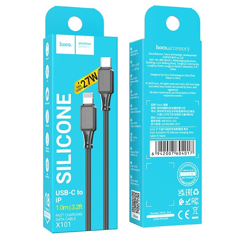 X101 Assistant Type-C to Lightning cable supports PD 27W fast charging for iPhone/iPad, silicone flexible tangle-resistant material weighing 25g and 1m length, perfect for quick charging & data transfer at home or on-the-go.