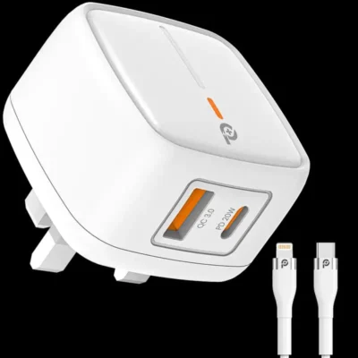 3.00 د.كشاحن حائط Powero+ بريطاني (UK 3-pin) بقوة 20 واط مع كابل Lightning إلى Type-C مدمج، يدعم شحن PD السريع (50% لـiPhone في 30 دقيقة)، مدخل عالمي 100-240V، حماية من زيادة التيار والحرارة، تصميم صغير ومتين من ABS مثالي للسفر والاستخدام اليومي مع توافق كامل لأجهزة Apple. -